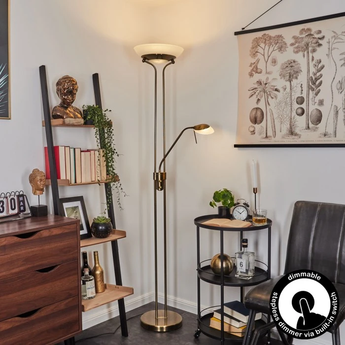 Diese Stehleuchte verfügt über einen An-/Ausschalter am Gehäuse, sowie einen Tastdimmer.